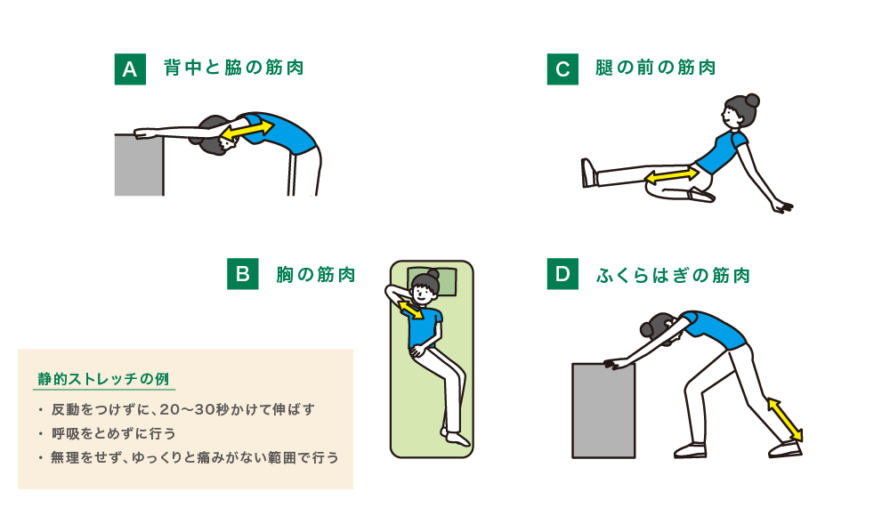 運動で使った部位や筋肉痛になりそうな筋肉を、20~30秒かけてゆっくりと伸ばします。静的ストレッチをおこなう際は、呼吸を止めず、反動をつけないように注意しましょう。以下のイラストを参考にして、静的ストレッチを実施してみてください。