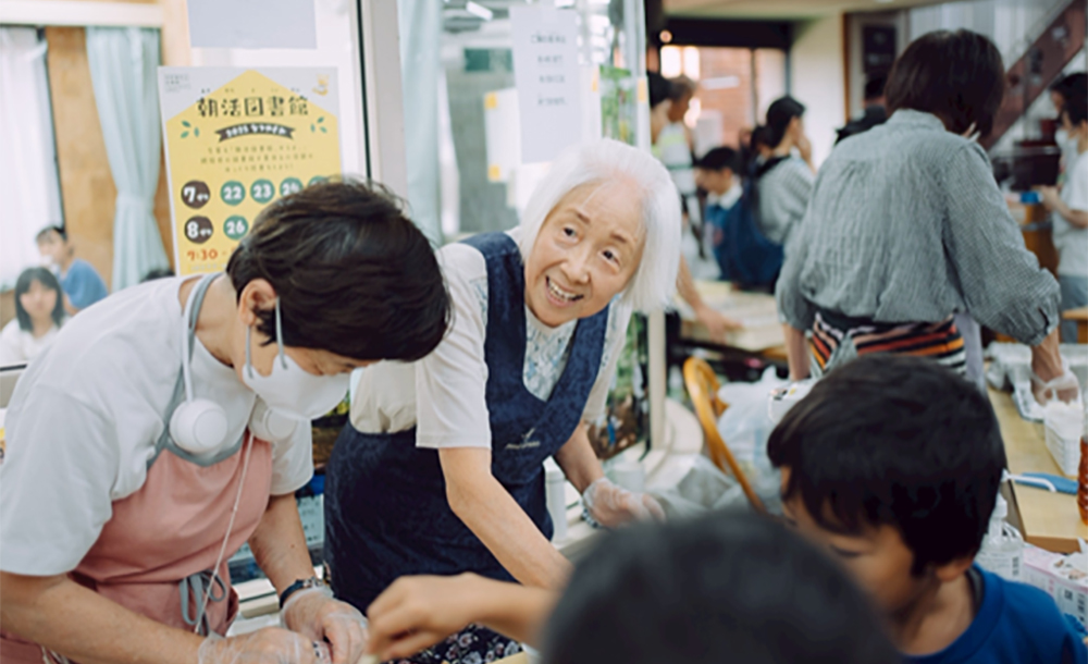 朝飯図書館を手伝うボランティアメンバー 井手さん:皆さん、健康になろうと思って図書館に来るわけではないけれども、身体活動の機会になる。地域の方もボランティアとして参加してくださっており、地域の見守りにもつながってきていると感じています。