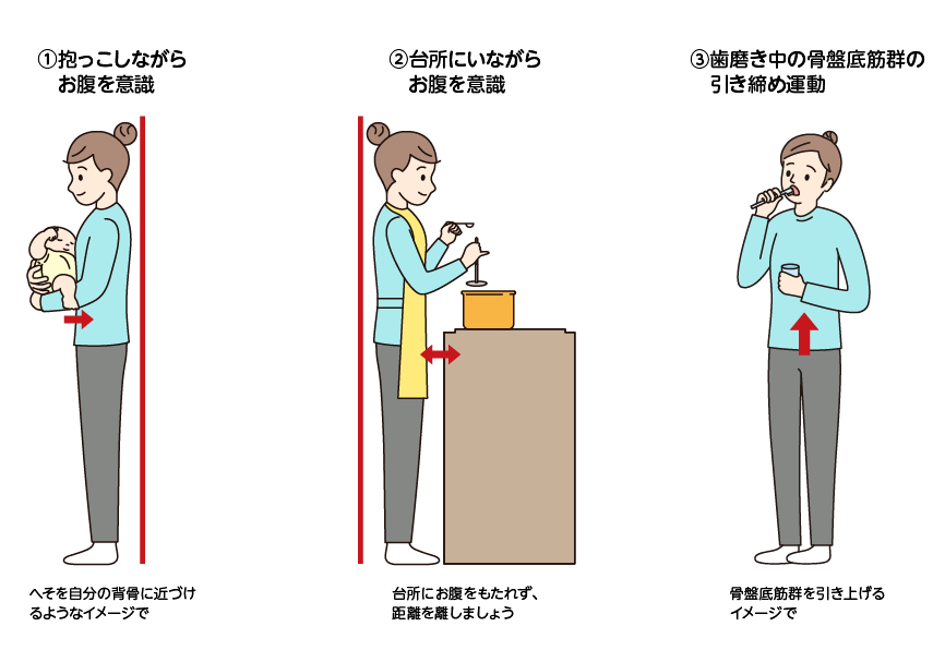 腹筋運動やストレッチが大切だと分かっていても、実際はなかなか時間が取れないものです。抱っこ中や調理などの立位の際は「臍(へそ)の位置を確認する」、「歯磨きしながら骨盤底筋群を引き締めてみる」などの、【~ながら運動】を心がけてみましょう。抱っこ中の軽めのスクワットも良いでしょう。
