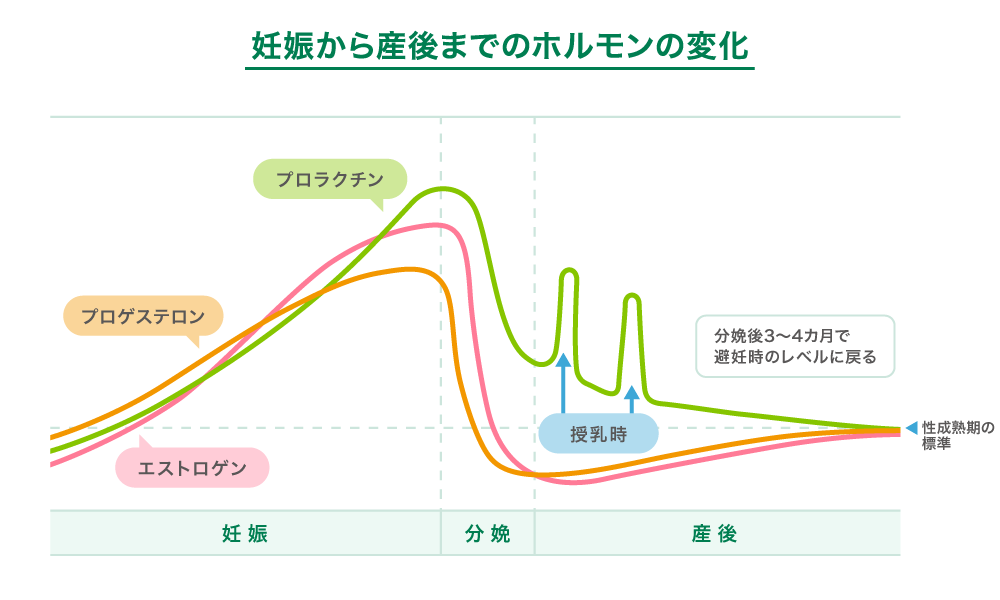 出産後はホルモン変動や睡眠不足、育児への不安など、心にも変化が生じやすくなります。出産直後はエストロゲンやプロゲステロンといったホルモンが急激に低下し、気分の落ち込みや涙もろさを感じやすくなります。これはマタニティブルーズと呼ばれ、出産後の多くの女性に見られる一時的な反応です。この後は徐々にホルモンは安定してきますが、夜間授乳などによる睡眠不足や孤立感、育児への責任感が重なって、育児中は思っている以上に気持ちの上下があり、不安定になりやすいです。身体の痛みや疲労も心理面に影響します。こうした状態が続くと産後うつへと進行することがあります。「ホルモンの乱れ」と「生活環境の変化」が重なる時期(産後1〜3か月)は特に注意が必要といわれています。