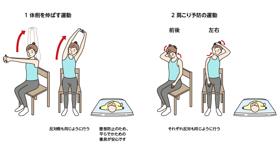 産後は軽いストレッチや呼吸運動で体を整えることで、心の安定に効果的ともいわれています。ベビーカーを使用して赤ちゃんやパートナーと一緒に散歩することも良いでしょう。運動が苦手な方でも、外の空気に触れて、近所を散歩するだけでも大丈夫です。