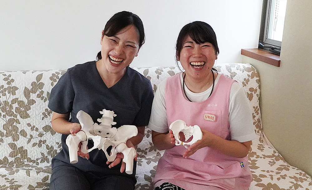筋肉のかたさや左右差、関節の動きなどの理学療法士の専門知識は、助産師が気づきにくい点を補完してくれています。また、妊婦さんは尖腹(せんぷく)といって、反り腰などの姿勢が原因でお腹の赤ちゃんが前に突き出る現象が起きることがあります。そのような場合にも、姿勢や筋骨格のアライメント、関節の動きについて理学療法士からフィードバックをしてもらえて、役割分担ができて良いなと思っています。理学療法士から「この方、お腹が張り気味ですよ」などと伝えてもらうこともあり、40分しっかりと向き合ってケアをしてくれる分、ママから私たち助産師とは少し違う言葉を引き出しくれることがあります。その情報を共有してもらえて、私たち助産師も助かっています。
