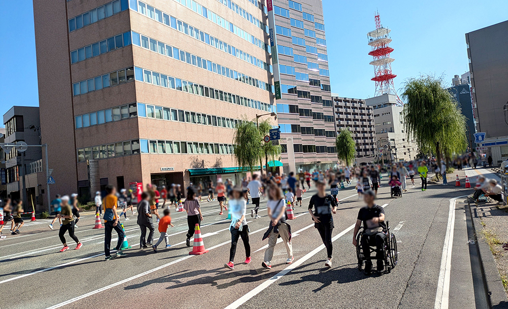 フルマラソン参加者とユニバーサルランの参加者が並走する様子。これが当たり前の風景になってほしいと語る山田さん(2024年10月撮影) 誰もがスポーツを楽しめる社会を目指して【後編】-「ユニバーサルラン」から広がるインクルーシブなまちづくり